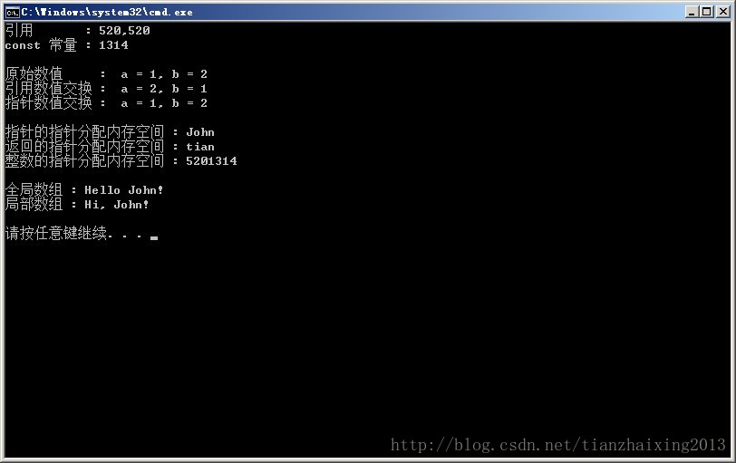 cout << "指针数值交换 : " << " a = " << a << "," << " b = " << b << endl;
